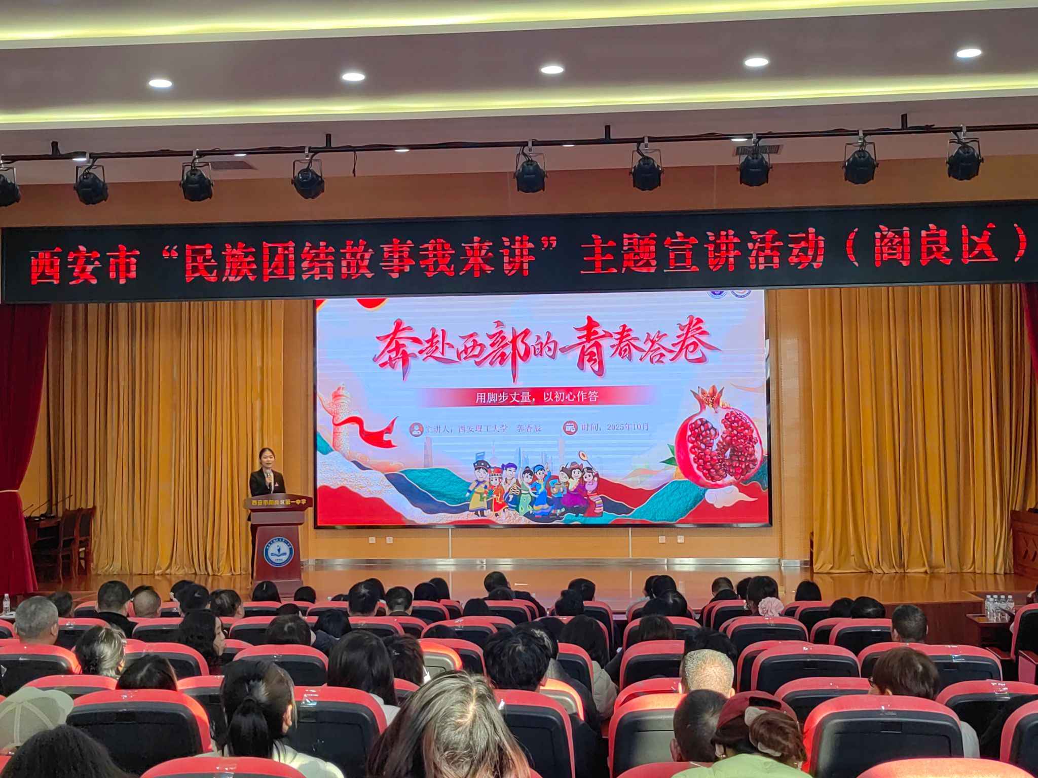 近日,西安市民宗委“民族团结故事我来讲”主题宣讲活动圆满结束。校人文与外国语学院秦疆心语推普服务队队长郭香辰,作为宣讲团中唯一的青年大学生,随宣讲团先后走进碑林区委党校、西安铁一中航空城分校、西安体育学院(鄠邑区)开展巡回宣讲。她以《奔赴西部的青春答卷》为题,用真挚的情感讲述赴疆实践故事,赢得全场一致好评,充分展现了学校作为国家、省级民族团结进步示范单位和市、区级铸牢中华民族共同体意识教育实践基地的育人成效。